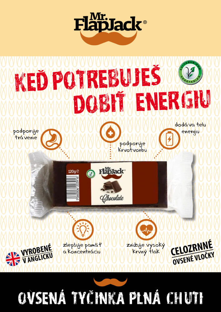 Tyčinka značky Mr. FlapJack je ručne vyrábaná celozrnná ovsená tyčinka z Veľkej Británie. Je plná energie a skvelej chuti. Vyrába sa podľa tradičnej britskej receptúry. Objem tyčinky je až 120 g.