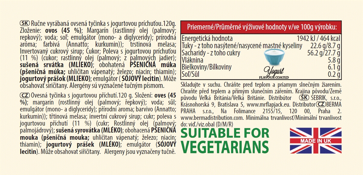 | Zloženie | jogurtový prášok (MLIEKO); emulgátor (SÓJOVY lecitin). Môže obsahovať siričitany. Alergény sú vyznačené tučným písmom., Ovos (45 %); Margarín (rastlinný olej (palmový; repkový); voda; soľ; emulgátor (mono- a diglyceridy); prírodná aróma; farbivá (Annatto; kurkumin)), sušená srvátka (MLIEKO); obohatená PŠENIČNÁ múka (pšeničná múka; uhličitan vápenatý; železo; niacin; thiamin), trstinová melasa; Invertovaný cukrový sirup; Cukor; Poleva s jogurtovou príchuťou (11 %) (cukor; rastlinný olej (palmový; z palmových jadier) |